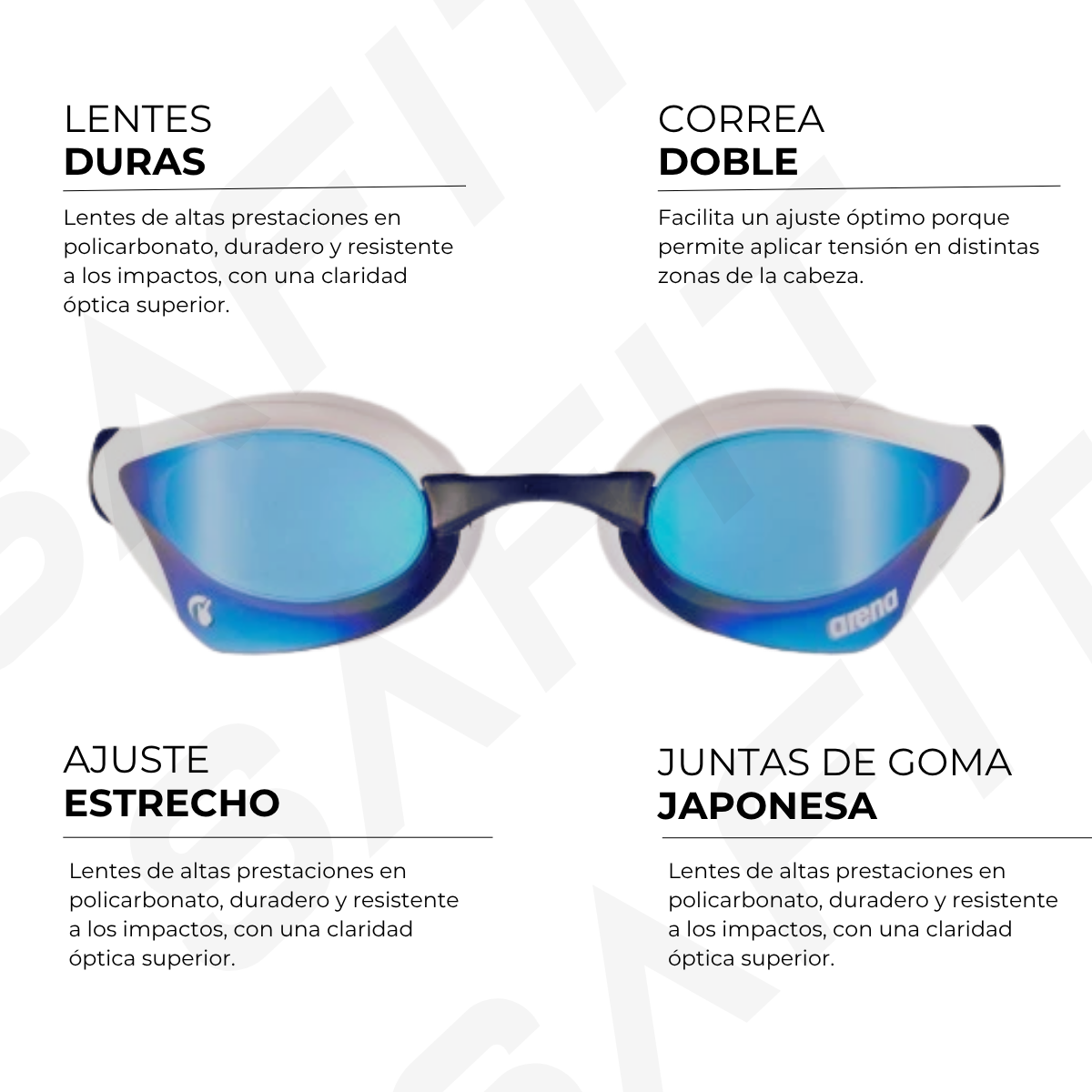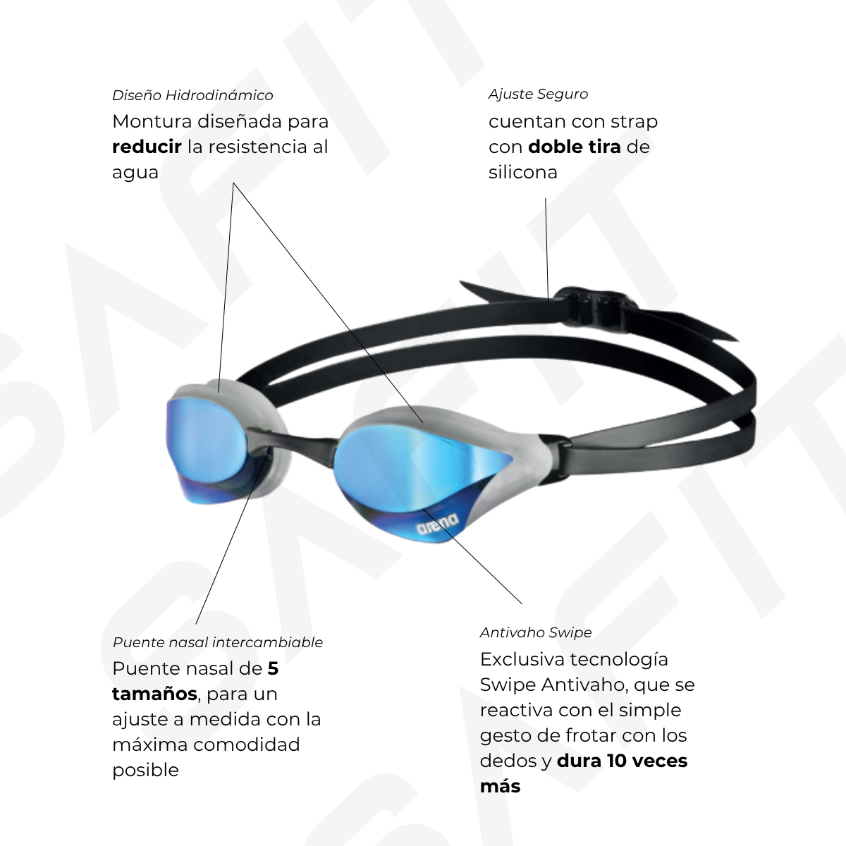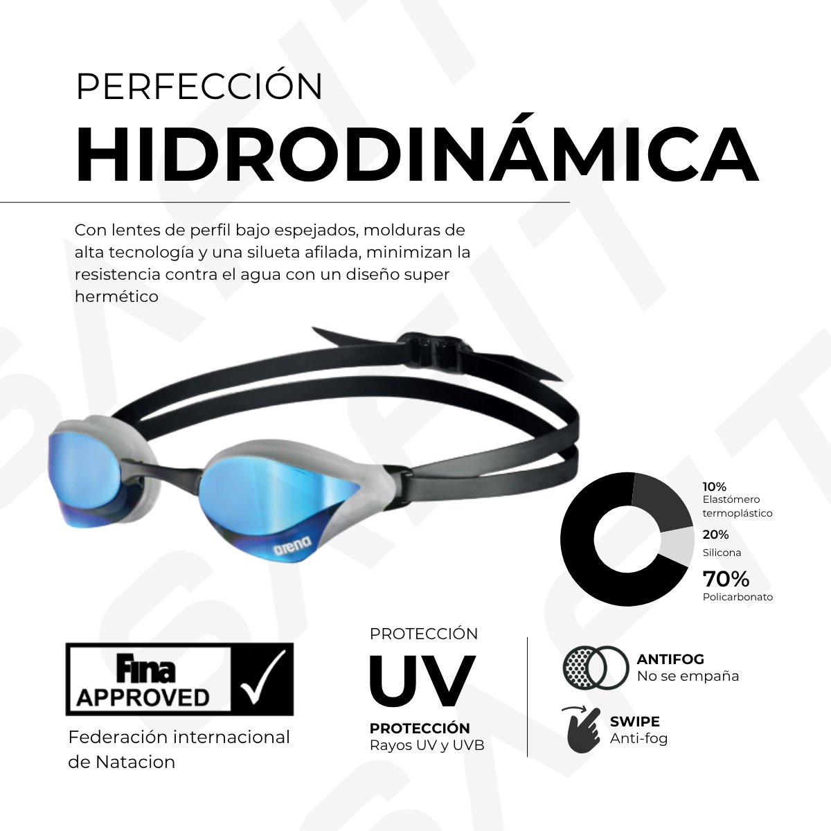 Los lentes de alta performance arena son producidos en policarbonato rígido con recubrimiento anti empañado para una visibilidad subacuática cristalina. Estas antiparras cuentan con strap con doble tira de silicona, 5 puentes nasales intercambiables y el clip arena RFA para un ajuste super seguro y personalizado.