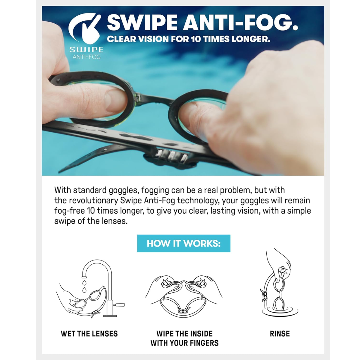 El pináculo de las gafas de carrera, nuestro diseño Cobra Ultra Swipe garantiza que puedas competir, entrenar y nadar durante largos períodos sin que las gafas se empañen o se muevan de su sitio. Este estilo altamente avanzado tiene una forma de lente especial para una visión integral y un deslizamiento ideal. Se ha mejorado con nuestra tecnología Anti-fog Swipe, que permanece despejado hasta 10 veces más. Cuando empiecen a empañarse, simplemente frota los lentes internos mientras las gafas estén bajo el agua. La mejor tecnología, el mejor rendimiento y aprobado por la FINA.