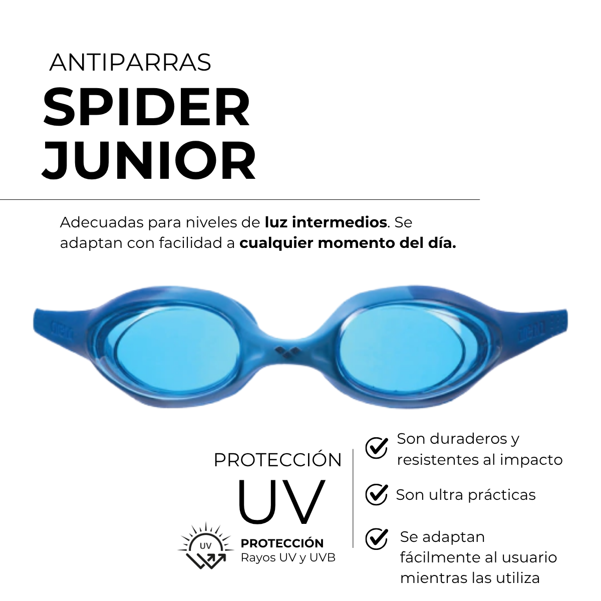 ¿Buscás unas antiparras simples y sin complicaciones al momento de comenzar con tu jornada de natación?. Las nuevas antiparras arena Spider Junior son ultra prácticas con un sistema de ajuste de correa única a través de un clip trasero que permite un ajuste rápido y preciso sin necesidad de un adulto colaborando para su colocación.