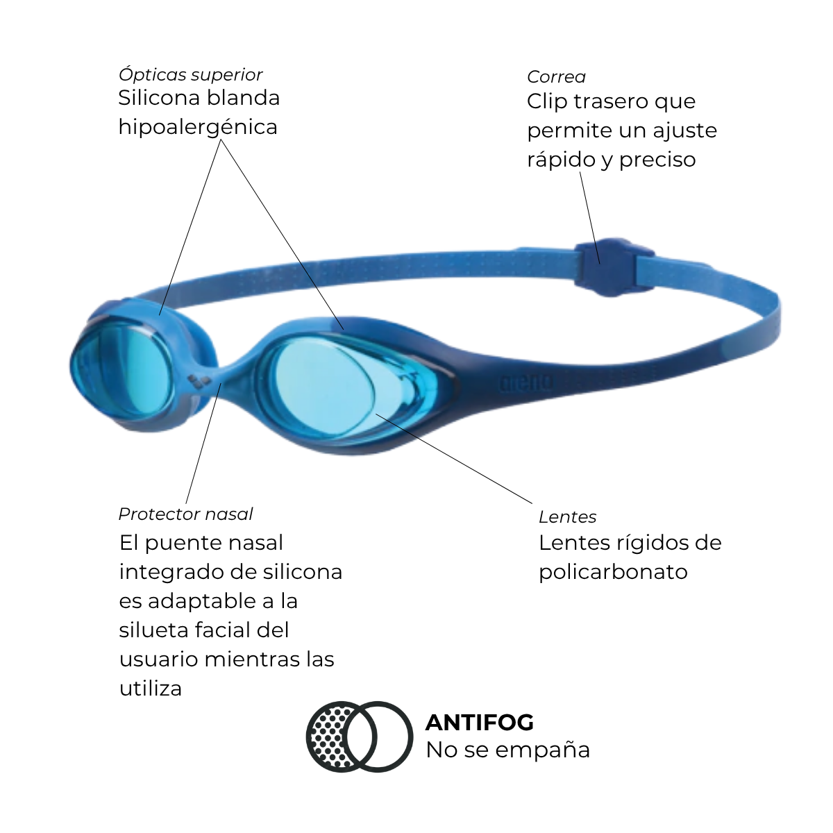 Como todas las antiparras arena, cuentan con protección UV y anti empañado. Para optimizar la preservación de tus lentes de antiparras te recomendamos utilizar arena Antifog Spray&Swim.