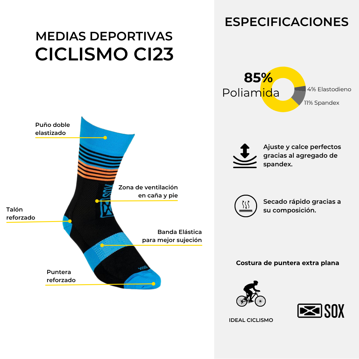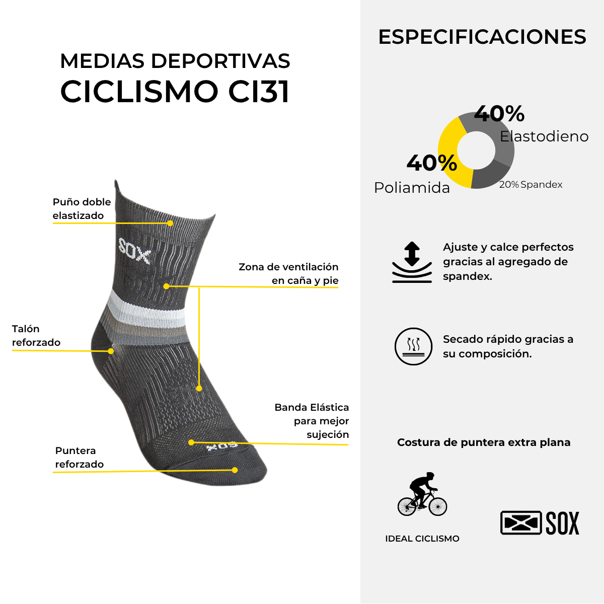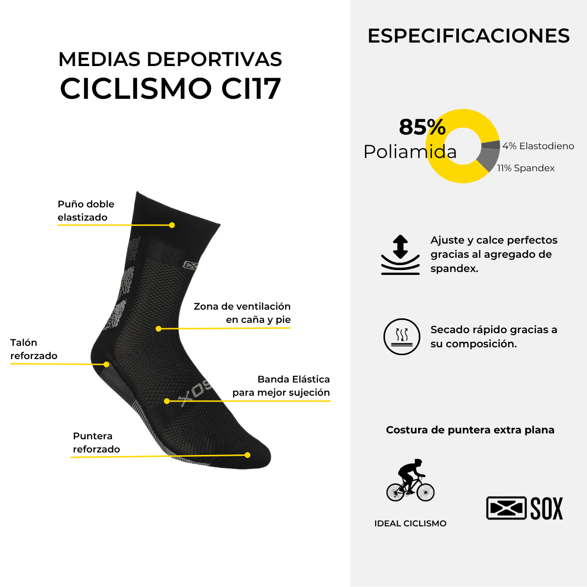 Art. CI17C: Puño doble elastizado, tejido liso, banda elástica en el pie para mejor sujeción, zona de ventilación en caña y pie para mantenerlo seco. Costura de puntera extra plana, talón y puntera reforzados. Ajuste y calce perfectos gracias al agregado de spandex. Secado rápido gracias a su composición.