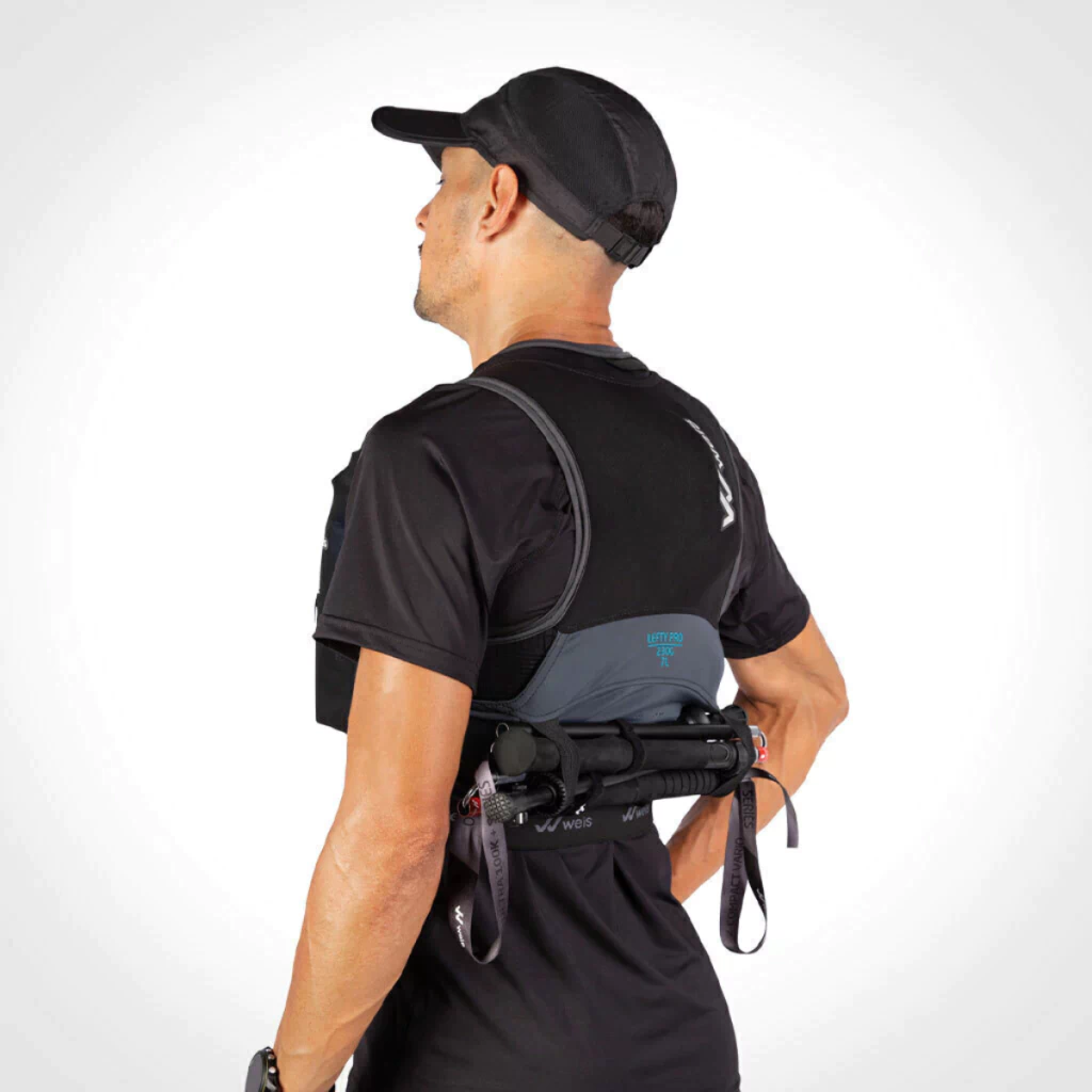Con el chaleco LEFTY PRO 7 L, el Departamento de I+D de Weis logró crear un chaleco ultra liviano, de un material 100% transpirable y flexible, con sistema de cierre con un 40% más de capacidad frontal, que a la vez aumenta su capacidad posterior, permitiendo así la carga de todos los elementos obligatorios que exigen las carreras de largas distancias y un par de bastones.
