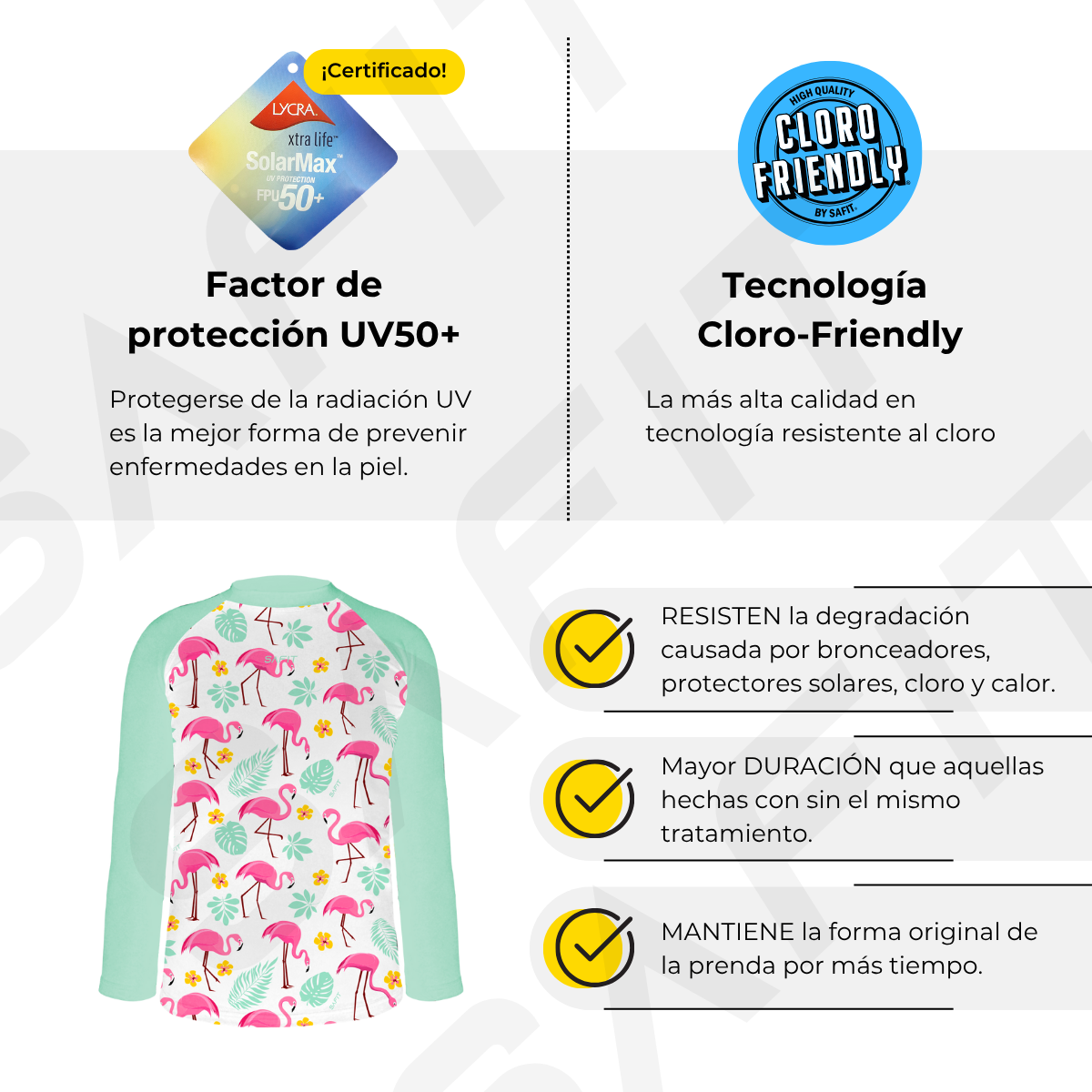 - Confeccionadas con un tejido elástico de alta calidad con LYCRA®, de 250 (G/M2), que impide el pasaje de rayos UVA y UVB.