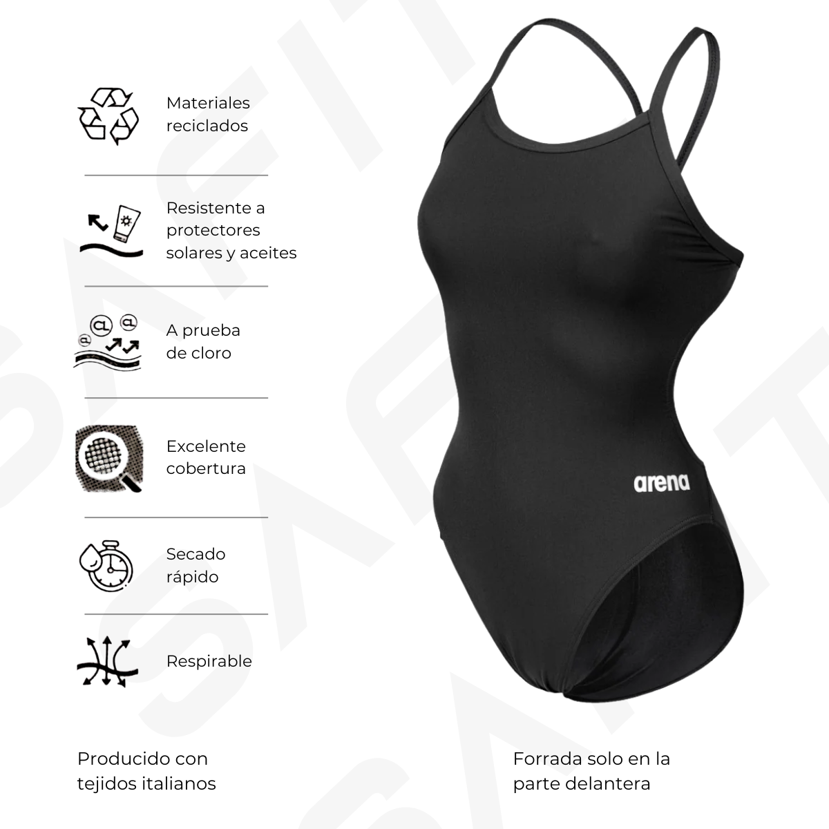 Incorpora espalda Challenge de breteles y tirantes finos ofreciendo gran abertura en espalda y una total libertad de movimientso en hombros y espalda minimizando el contacto con el agua y mejorando la fricción. Además, para evitar transparencias indeseadas, cuenta con forro frontal.
