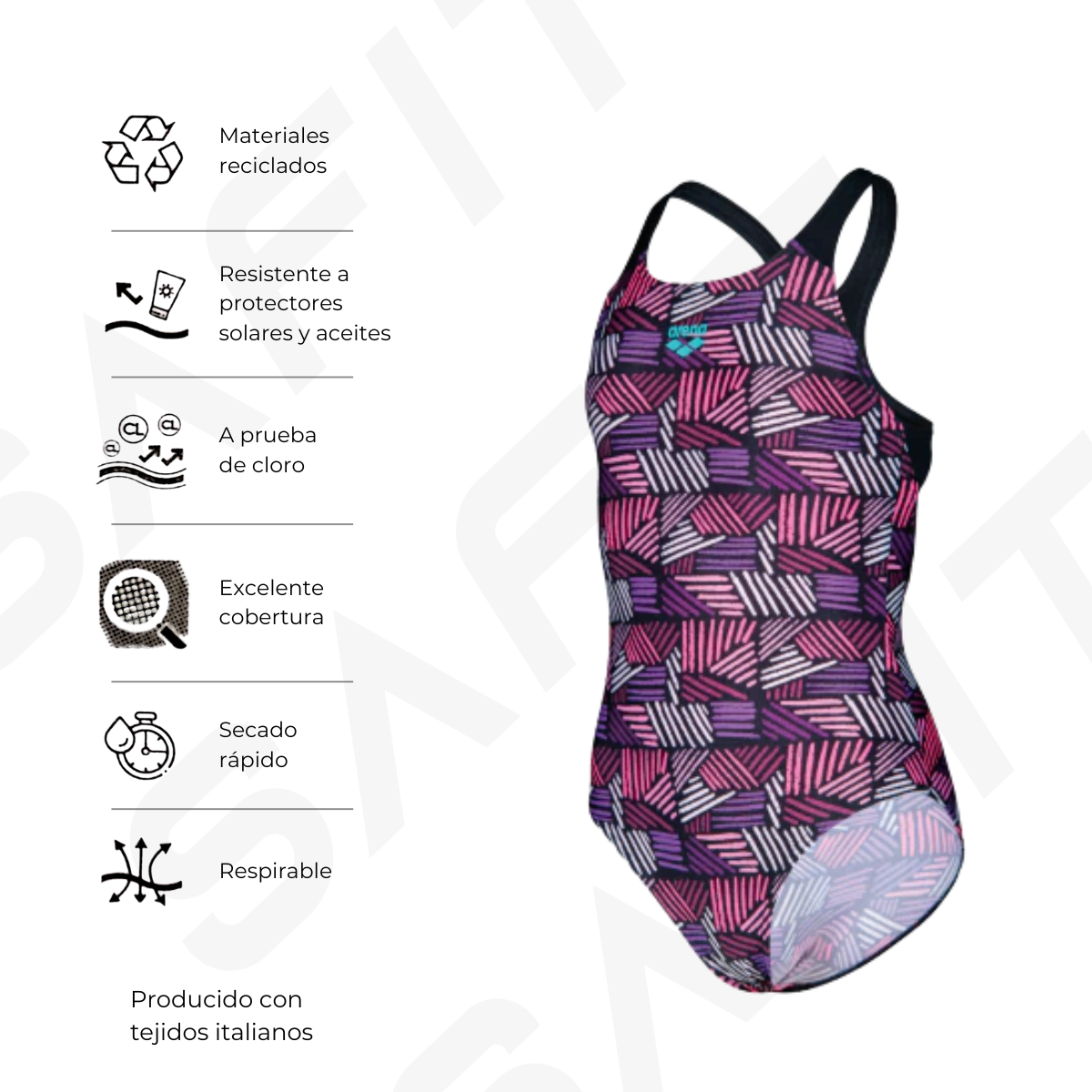 Maxlife Eco es la evolución del tradicional y exitoso tejido de arena para entrenamiento intensivo en el agua, brindando una máxima resistencia al agua clorada.
