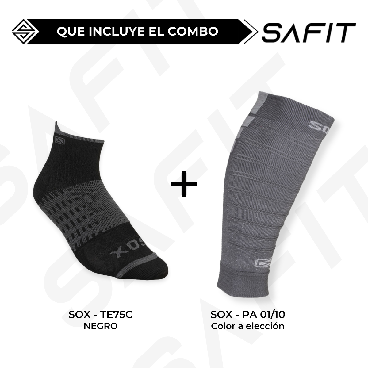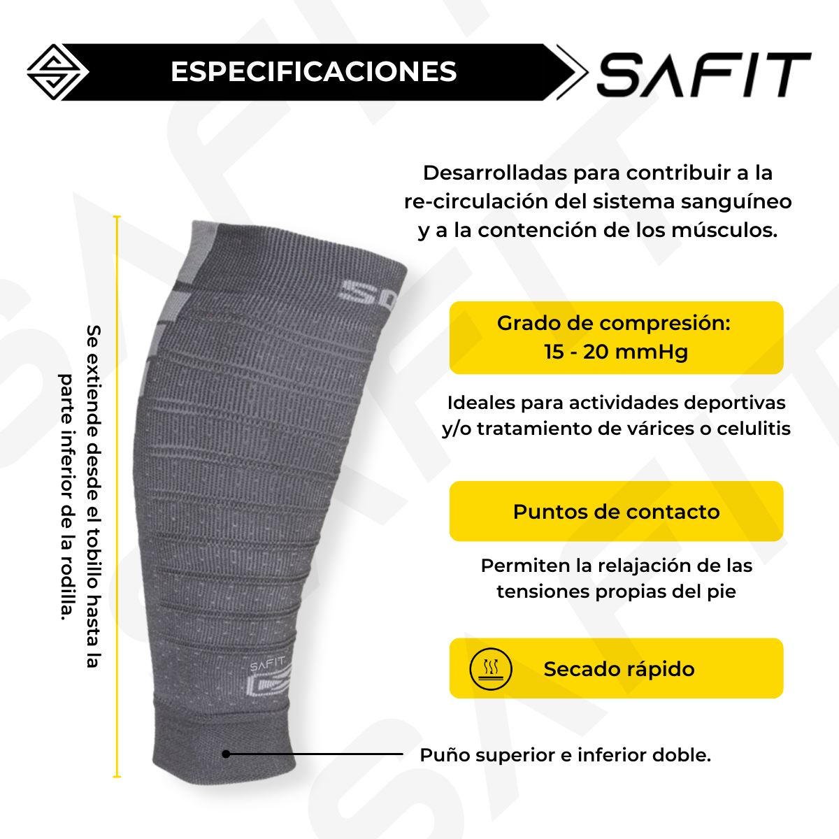 Se extiende desde el tobillo hasta la parte inferior de la rodilla. Pantorrilleras de compresión graduada pensadas para el deportista. Desarrolladas para contribuir a la re-circulación del sistema sanguíneo y a la contención de los músculos. El agregado de puntos de contacto permite la relajación de las tensiones propias del pie. Permiten que el usuario las combine con medias específicas como soquetes para running, por ejemplo.