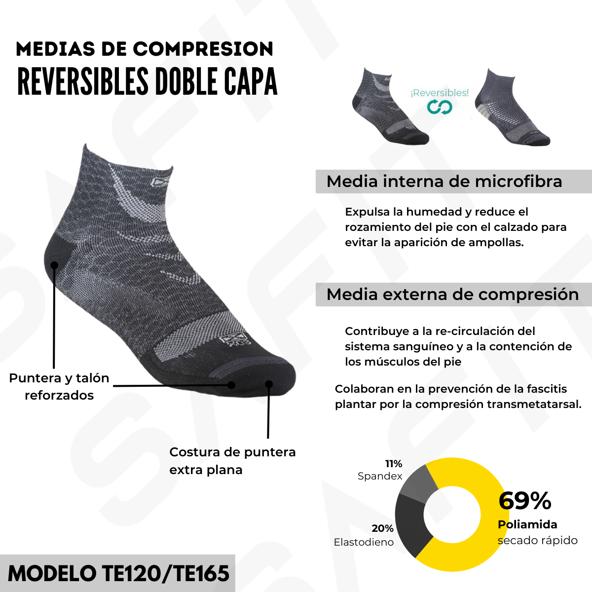 Medias para running con media interna incorporada, que expulsa la humedad hacia el exterior y reduce el rozamiento del pie con el calzado para evitar la aparición de ampollas. Con tecnología de compresión para contribuir a la re-circulación del sitema sanguíneo y a la contención de los músculos del pie. Colaboran en la prevención de la fascitis plantar por la compresión transmetatarsal. Costura de puntera extra plana, talón y puntera reforzados. Diseño reversible, lo cual permite utilizarlas de ambos lados manteniendo siempre sus beneficios. Secado rápido gracias a su composición.