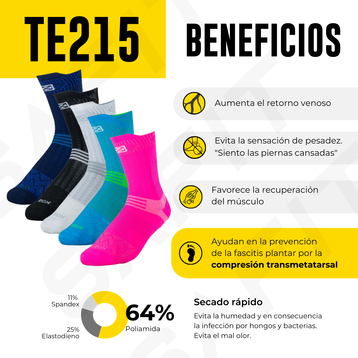 Medias de compresión pensadas para el deportista. Desarrolladas para contribuir a la re-circulación del sistema sanguíneo y a la contención de los músculos. Colaboran en la prevención de la fascitis plantar por la compresión transmetatarsal. Puño doble elastizado, caña y pie anatómicos, sectores específicos de ventilación para evitar el calentamiento del pie. Puntos de apoyo sectorizados con mayor densidad para absorber impactos, talón y puntera con canales de ventilación y reforzados. Costura de puntera extra plana, secado rápido gracias a su composición.
