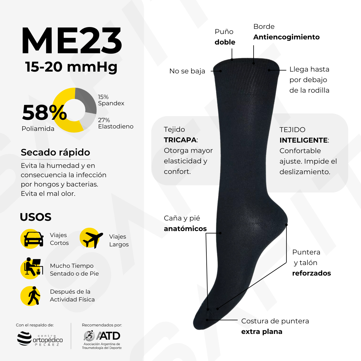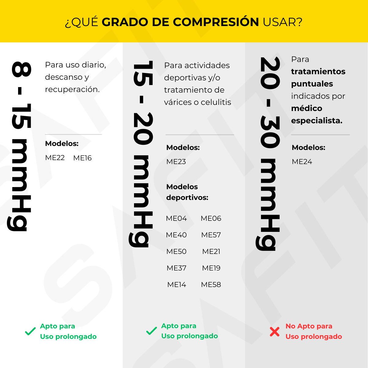 - Medias de compresión graduada, con áreas precisas de presión 15-20 mmHg para determinados sectores de la pierna.