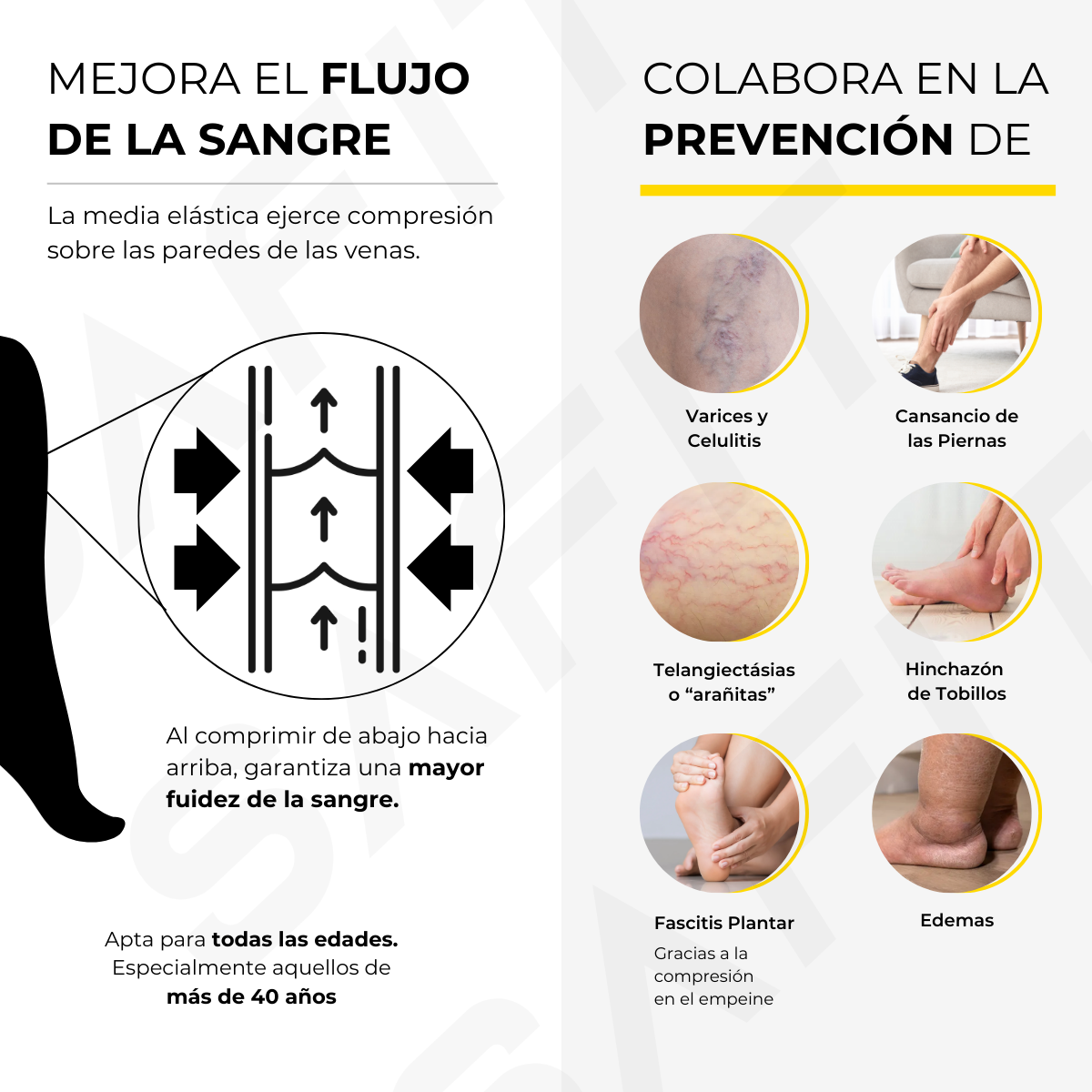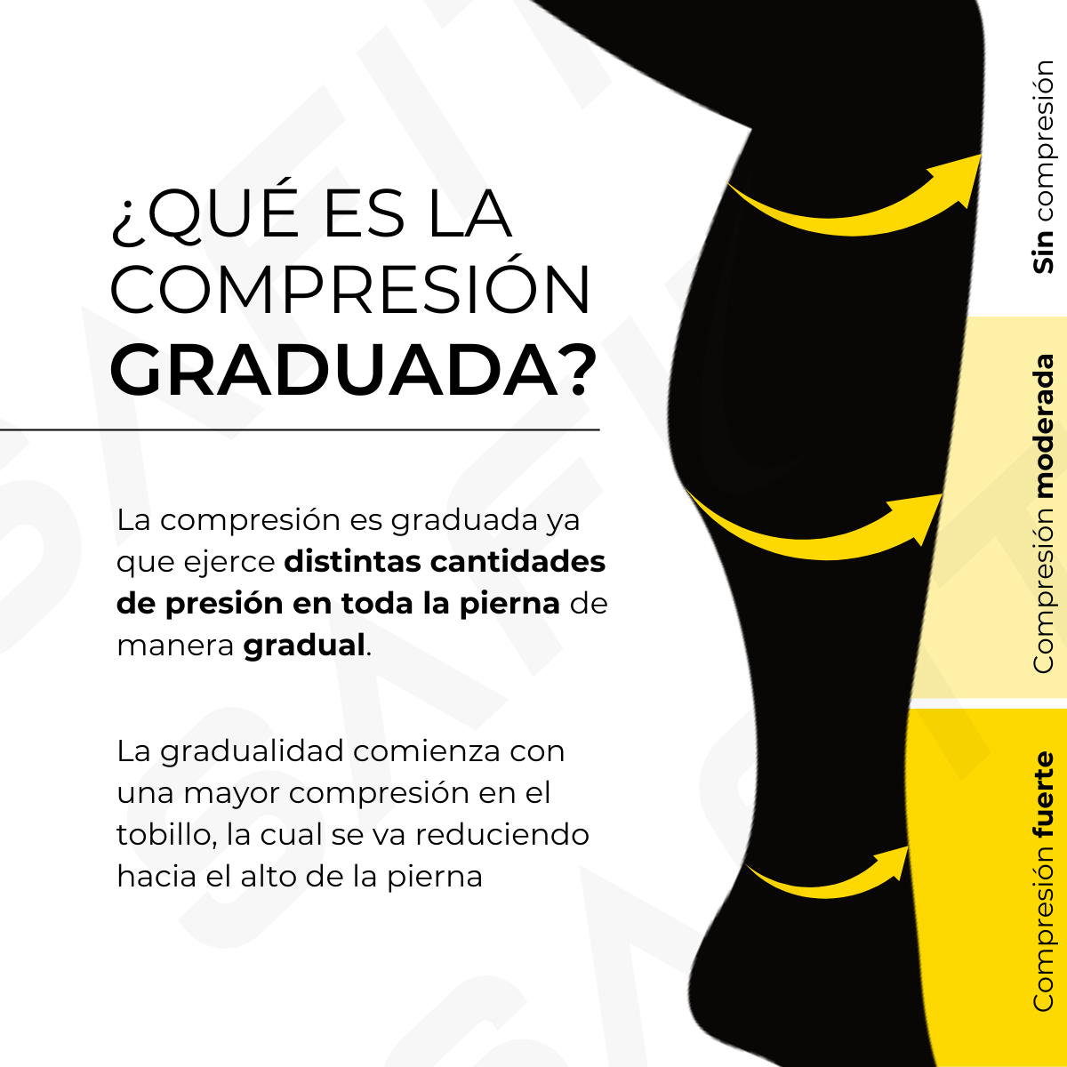- Con mayor compresión en el tobillo, reduciéndola gradualmente hacia lo alto de la media.