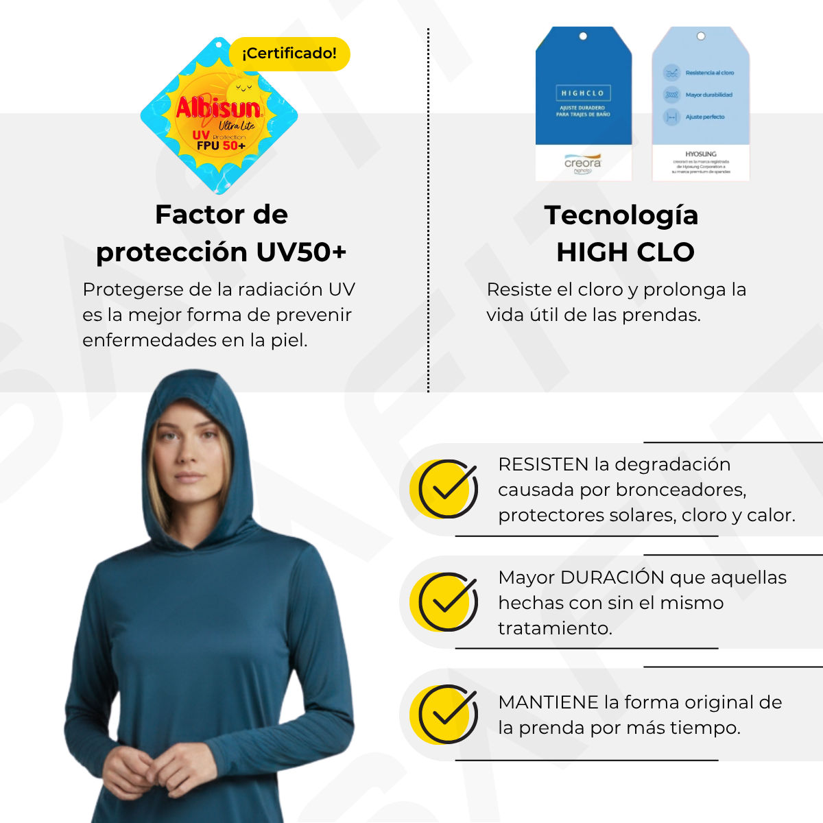 Remera UV con Capucha Mujer Tejido Albisun Tecnología HighClo® Pesca Surf Playa Pileta Aguas Cloradas Anti cloro Sol Proteccion solar