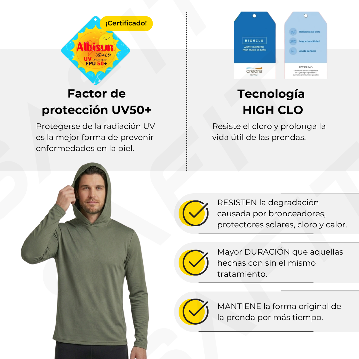 Remera UV con Capucha Hombre Tejido Albisun Tecnología HighClo® Pesca Surf Playa Pileta Aguas Cloradas Anti cloro Sol Proteccion solar